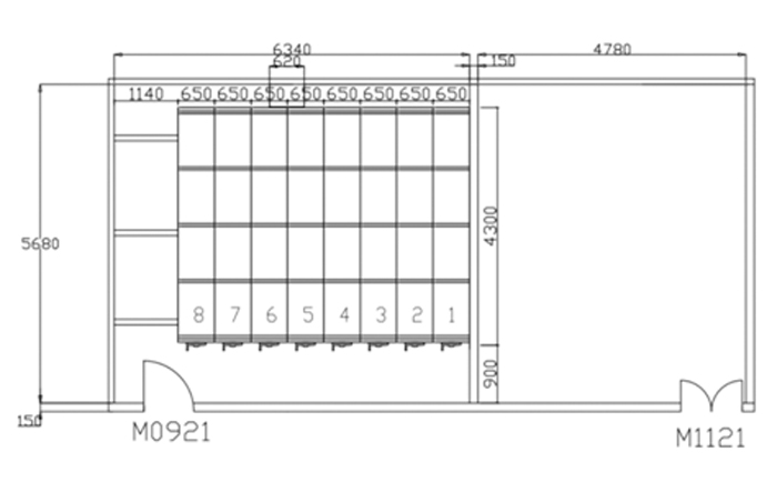 檔案室在三樓,通過現(xiàn)場測量,樓層的承重足夠, 唯一不足的是樓高只有2.2米。客戶希望能夠最大化的利用空間,擺放足夠多的檔案資料。本著合理保留工作空間的原則下,我司告訴用戶密集柜高度可以做到2米(五層)。且提交了如下平面圖設計稿: