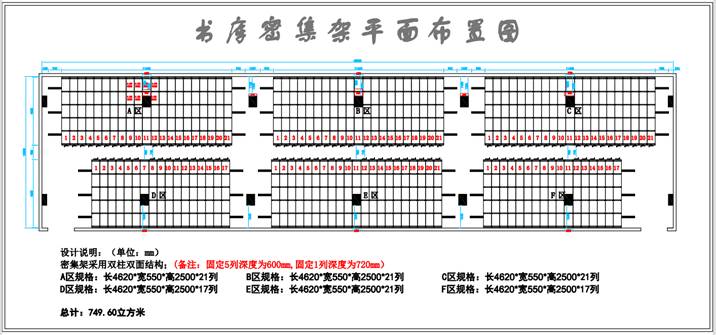 根據客戶前期提出的幾個要求,我司設計部與客戶溝通好后,根據書庫房間結構結合客戶的需求設計了118列密集架,因房間柱子較多分6個團體。